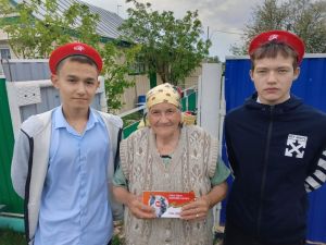 В преддверии великого Дня Победы юнармейцы отряда имени Артура Зайнуллина из Байрякинской школы, а также члены Движения Первых, тепло поздравили детей войны с наступающим праздником — 9 мая.