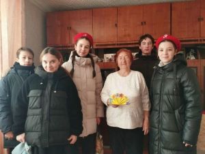 Воспитанники юнармейского отряда имени Артура Зайнуллина из Байрякинской школы навестили и поздравили с Международным женским днем ветерана педагогики Лилию Ахтямову.